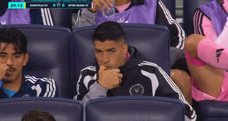 第30分钟,镜头给到替补席的苏亚雷斯,他正在津津有味地啃着手指